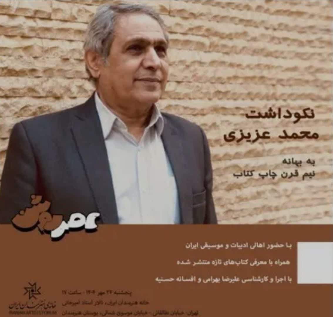 در بعدازظهر یک روز پاییزی و به دور از هیاهو، پنجشنبه ۲۴ مهر ماه ، در مراسمی که با استقبال فراوانی مواجه گشته بود و بیش از یکسوم جمعیت حاضر به دلیل نبودن جای خالی در تالار استاد امیرخانی، چند ساعت در بیرون ایستاده بودند، آیین نکوداشت «محمد عزیزی» به بهانه گذشت نیم قرن از فعالیت مستمر وی، در سلسله نشستهای «عصر روشن» در «خانه هنرمندان ایران» برگزار شد.